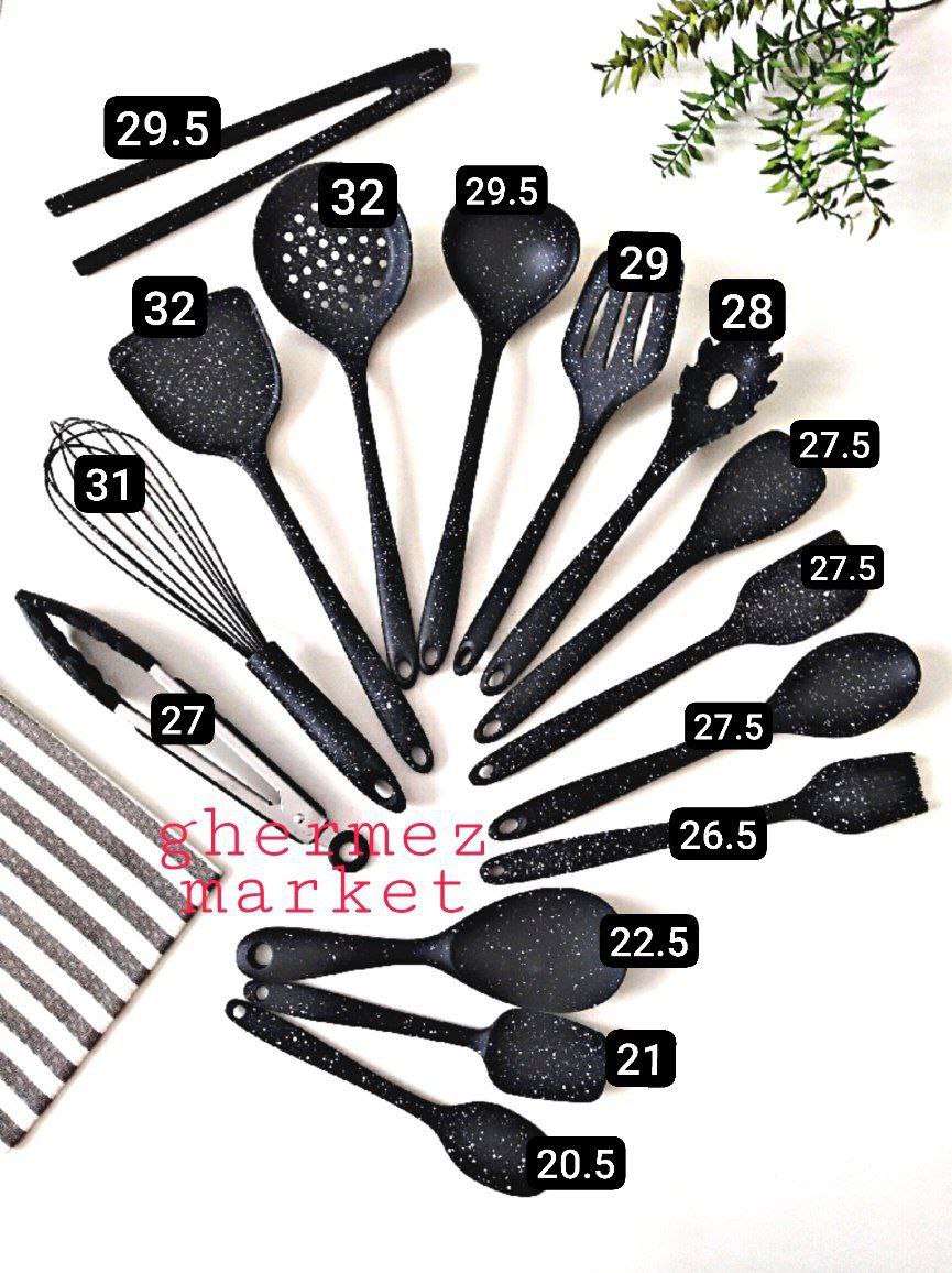 قاشق آشپزی پهن، قاشق آشپزی بلند، لیسک، تابه برگردان، کفگیر سوراخدار، کفگیر، ملاقه، کفگیر شیار دار، فرچه و انبر.